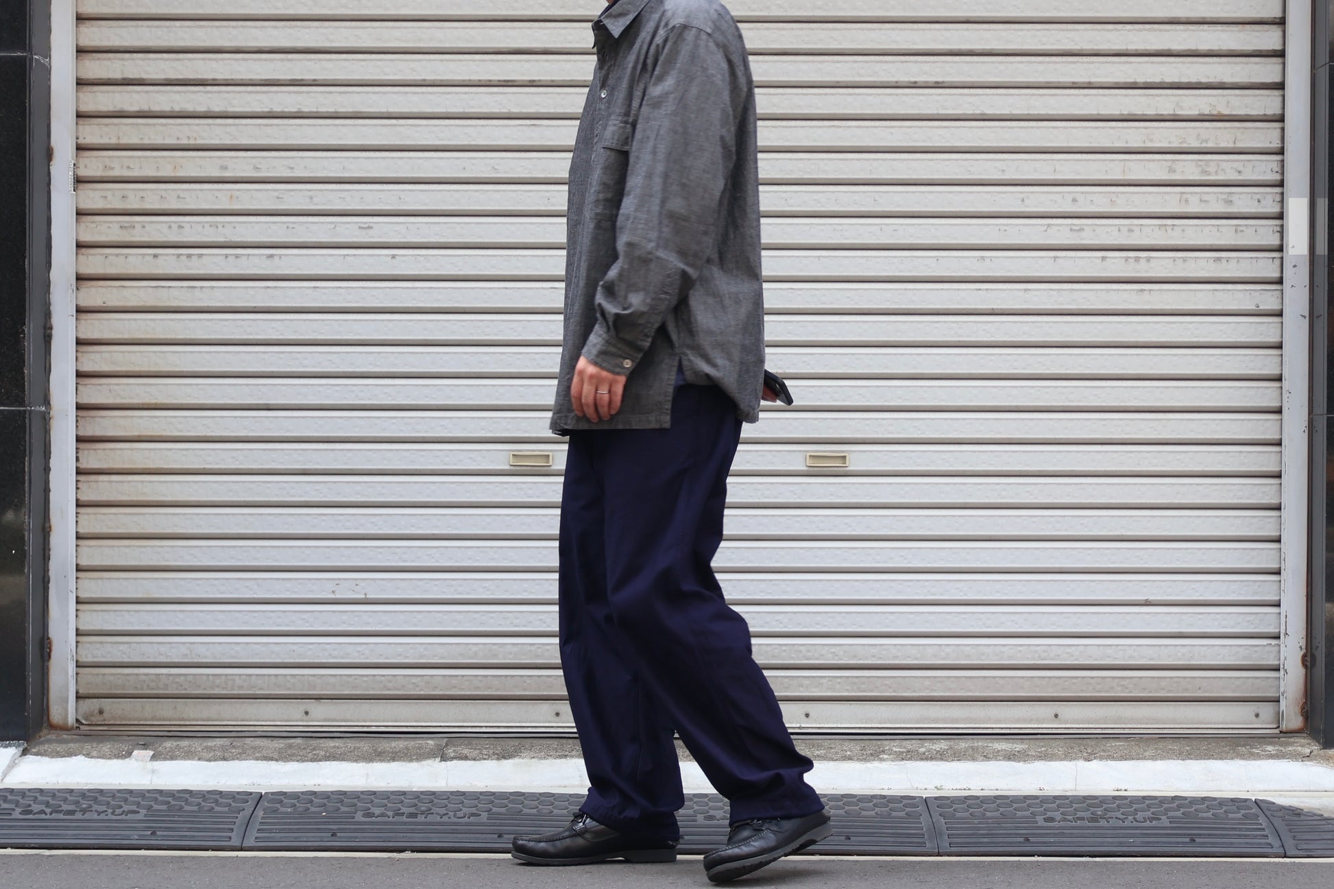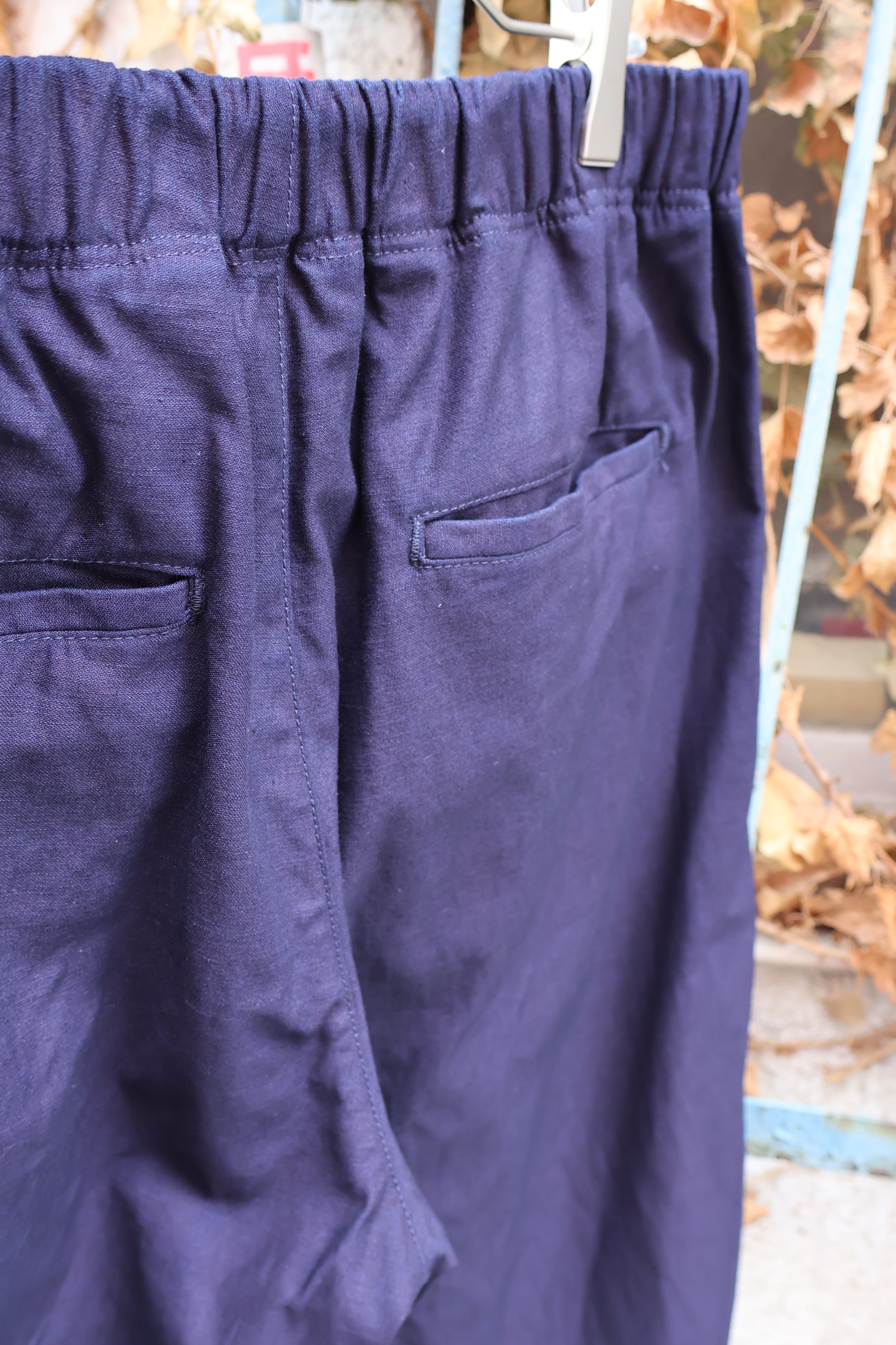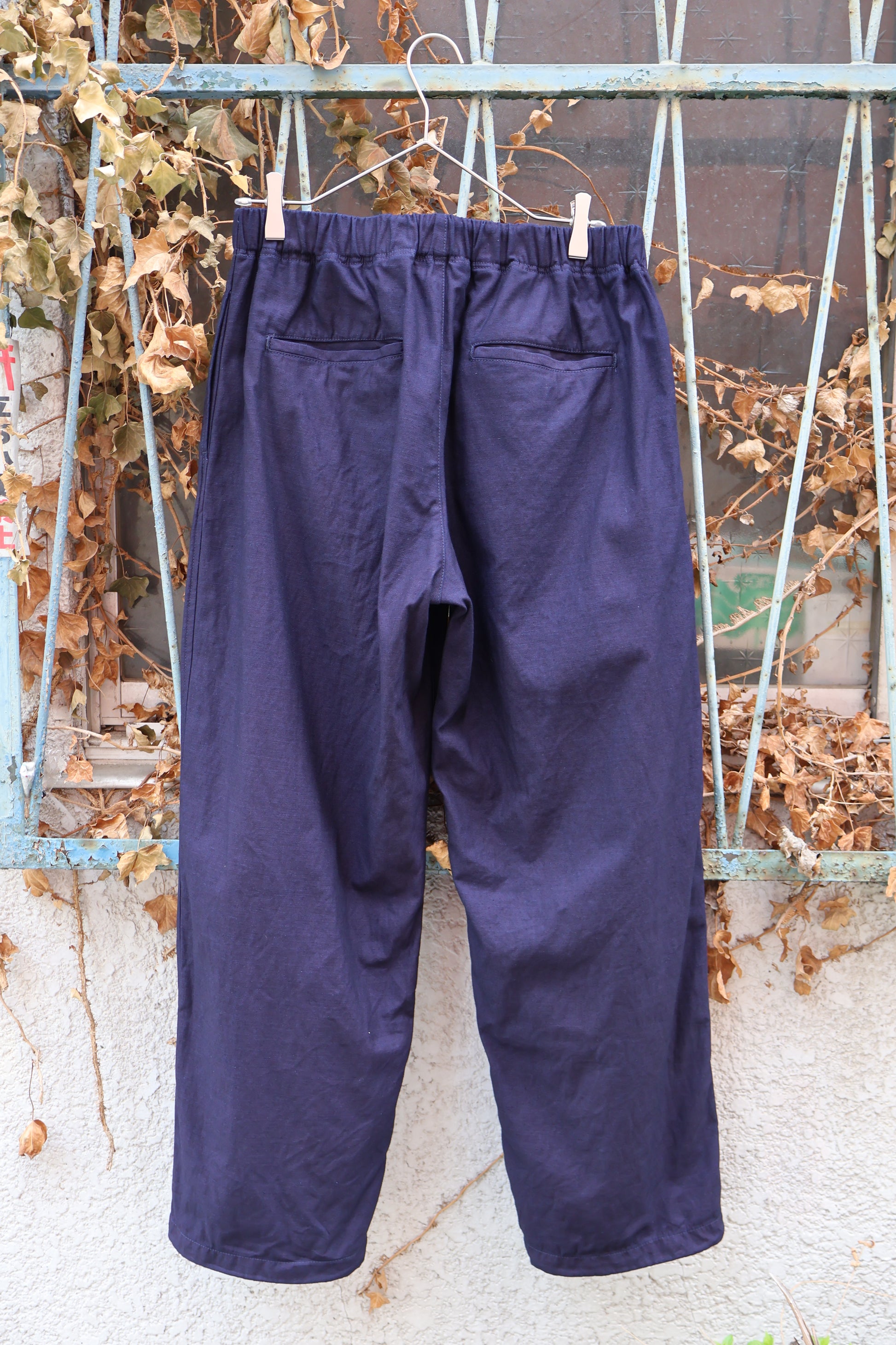 BLINK定番のEASY TROUSERSをベースに、インディゴ染めのリバースサテンにて作成。