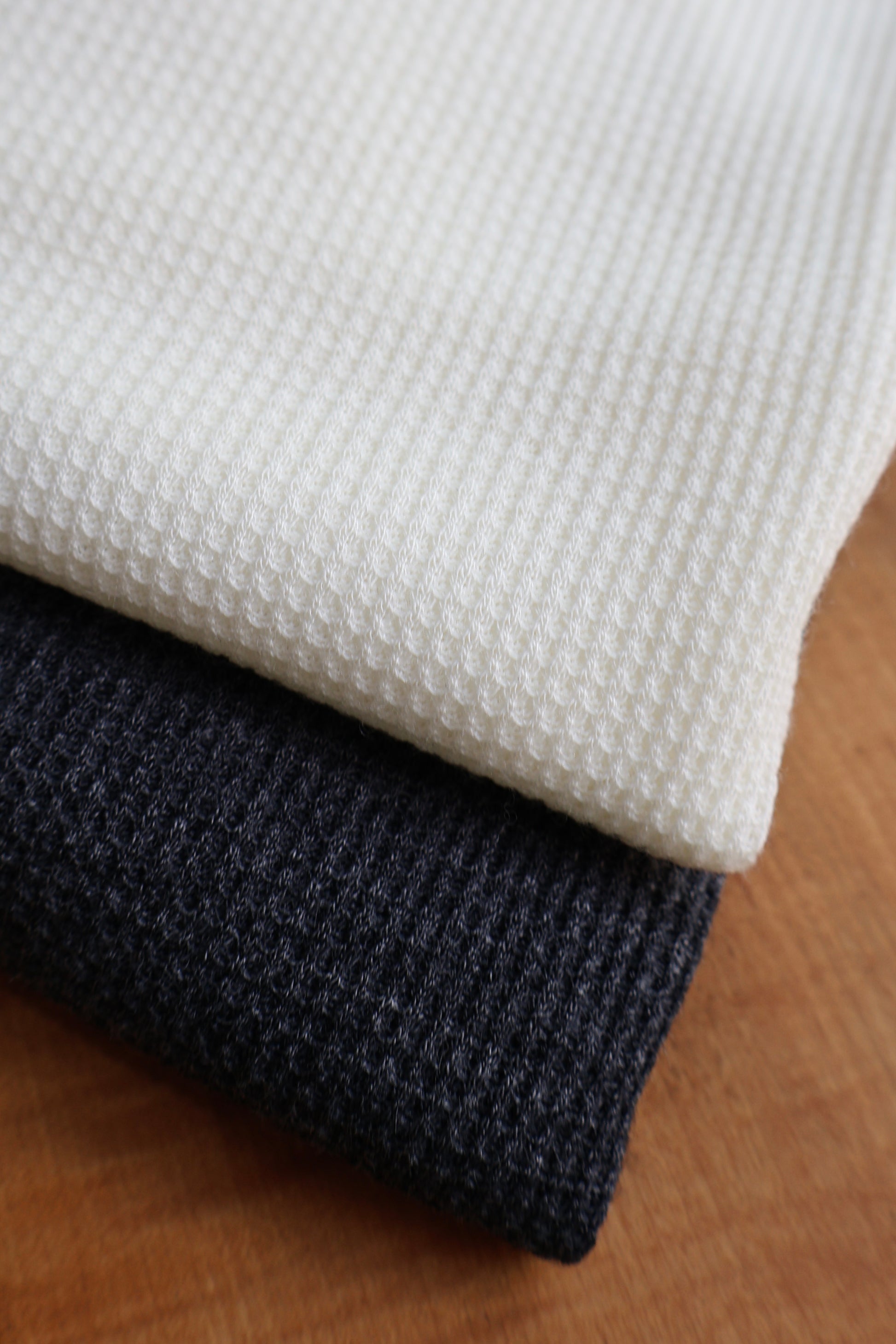 ポリエステル芯に、表面をメリノウールをカバーリングした糸を使った、ワッフル(サーマル)素材を使用。