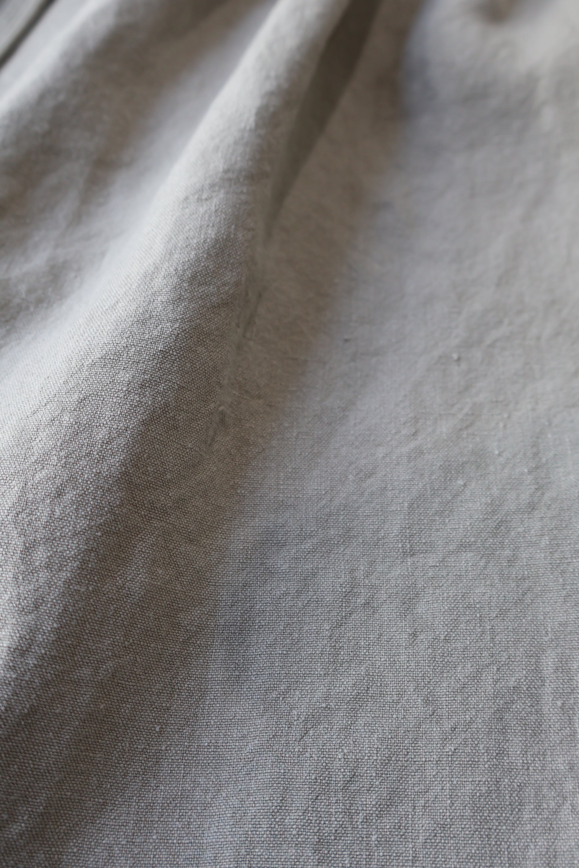 尾州地方の機屋にて製織したオリジナル素材。 中細番手のヘンプ糸を経緯共に限界の超高密度で織り上げた平織物。