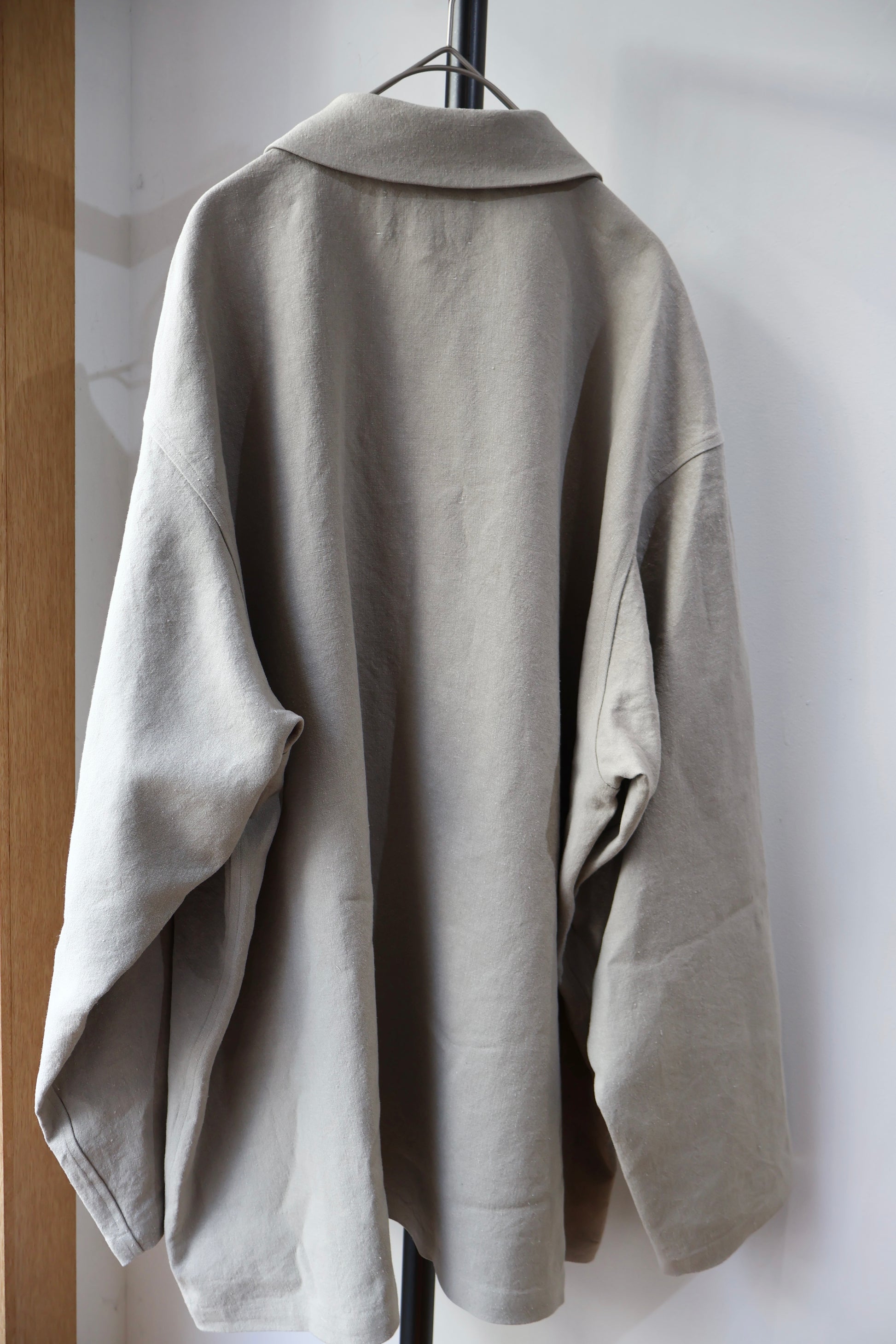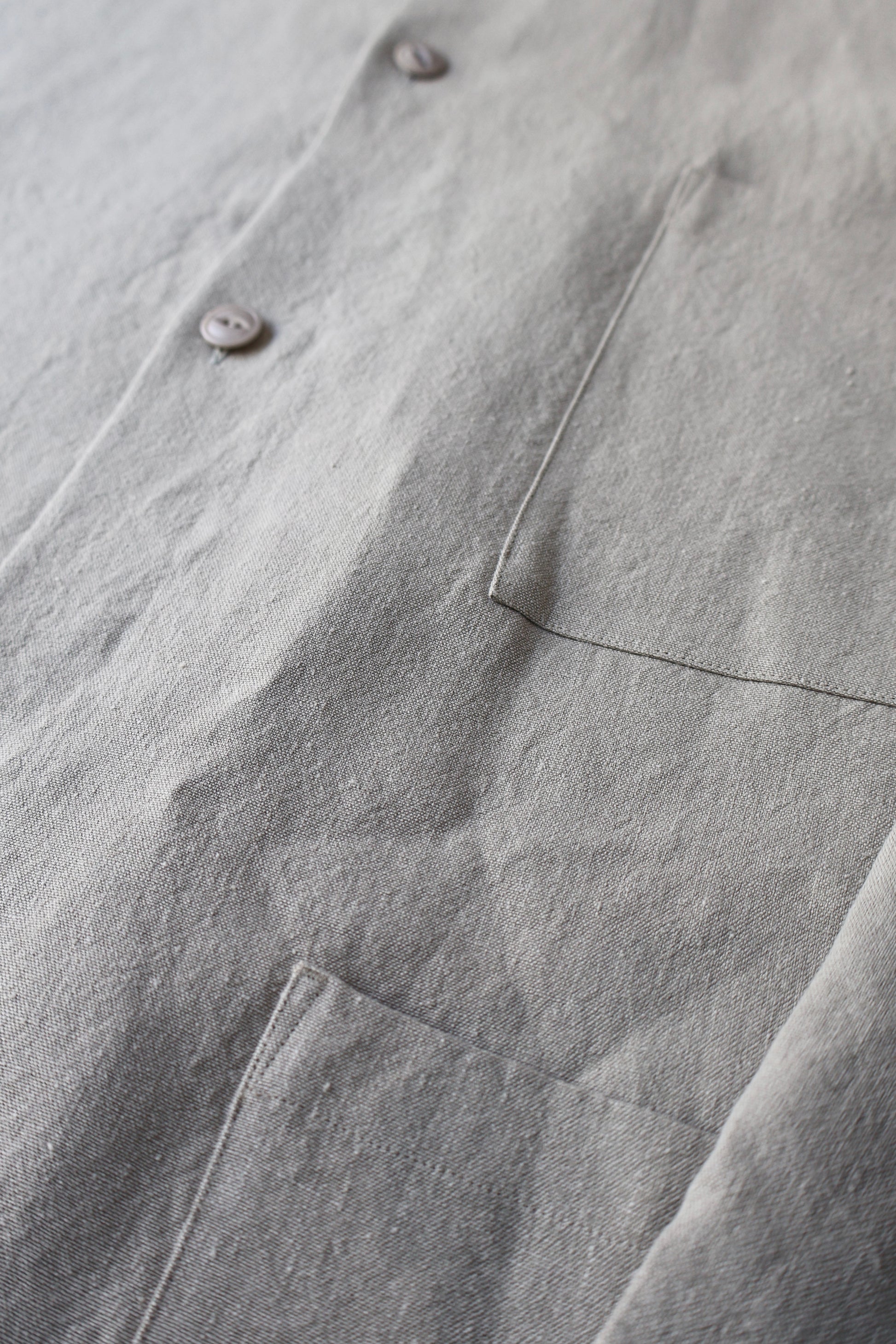 尾州地方の機屋にて製織したオリジナル素材。 中細番手のヘンプ糸を経緯共に限界の超高密度で織り上げた平織物。