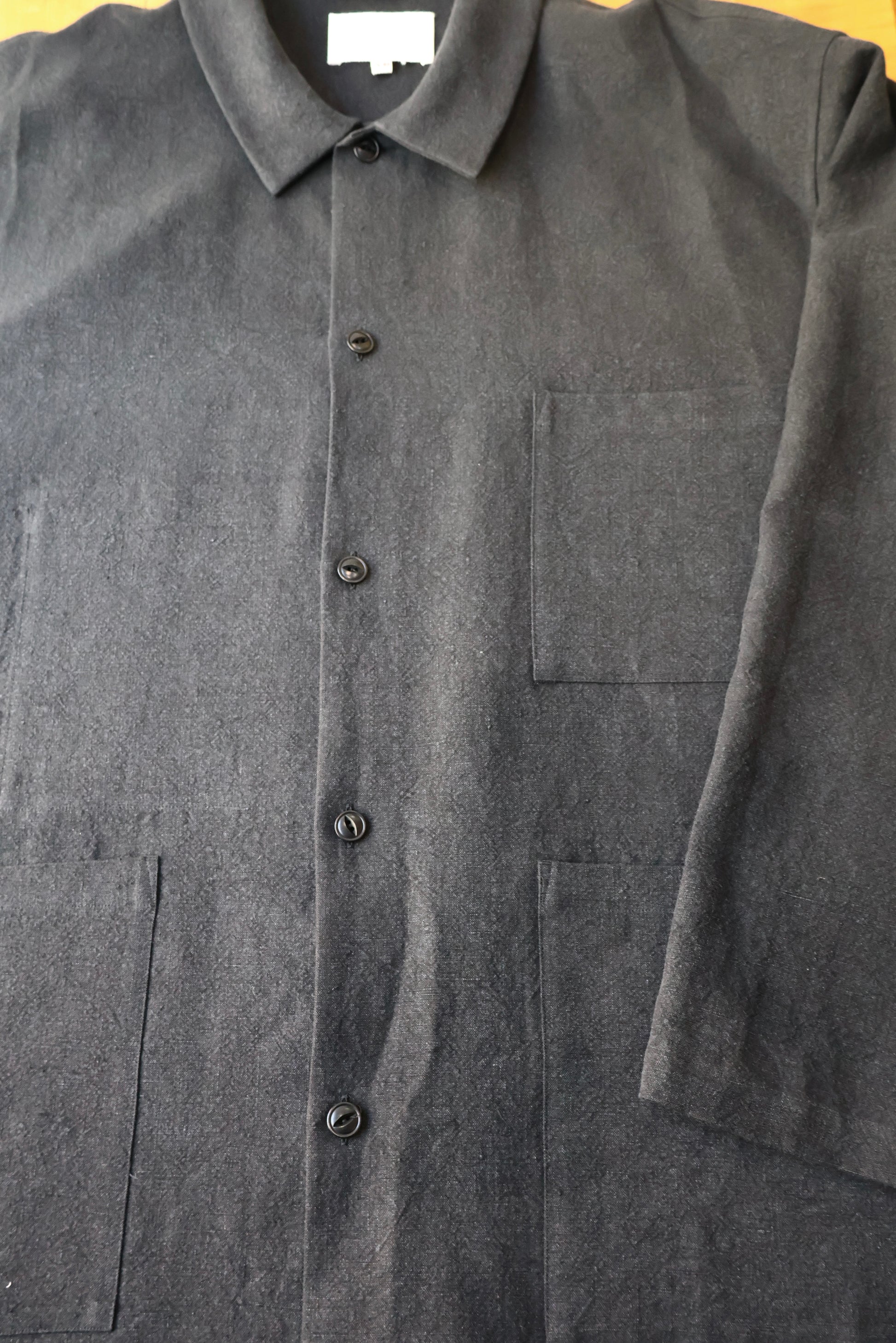 シャツとカバーオールの中間の様な型で、フロントパッチポケット×3と、右胸裏にもパッチポケット付き。